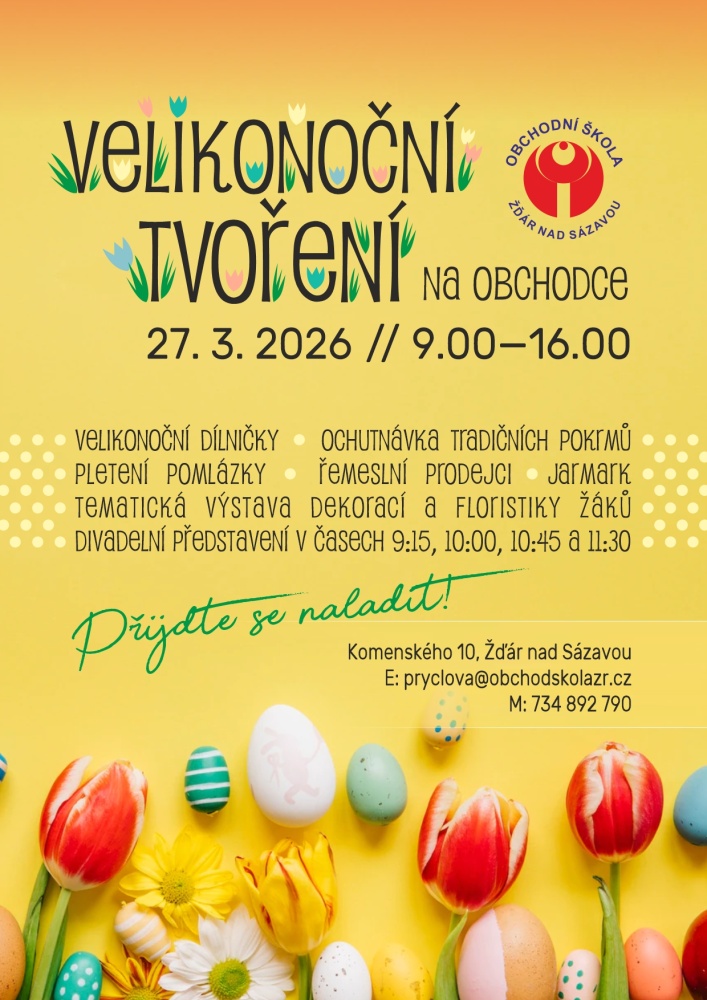 Velikonoční dílničky, ochutnávka tradičních pokrmů, pletení pomlázky, řemeslní prodejci, jarmark, tematická výstava dekorací a floristiky žáků, divadelní představení v časech 9:15, 10:00, 10:45 a 11:30.